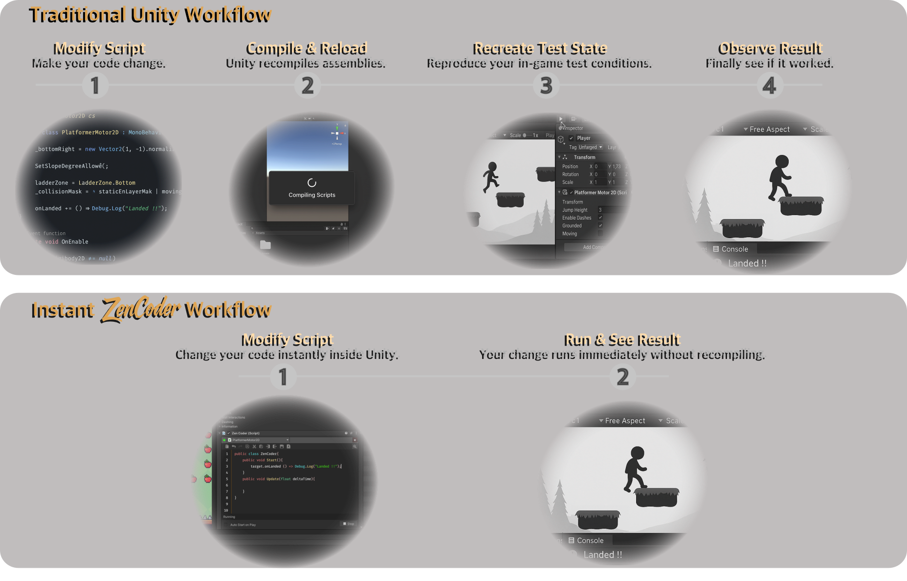 ZenCoder transforms your Inspector into an IDE. Write logic that runs now, not after a recompile. -
